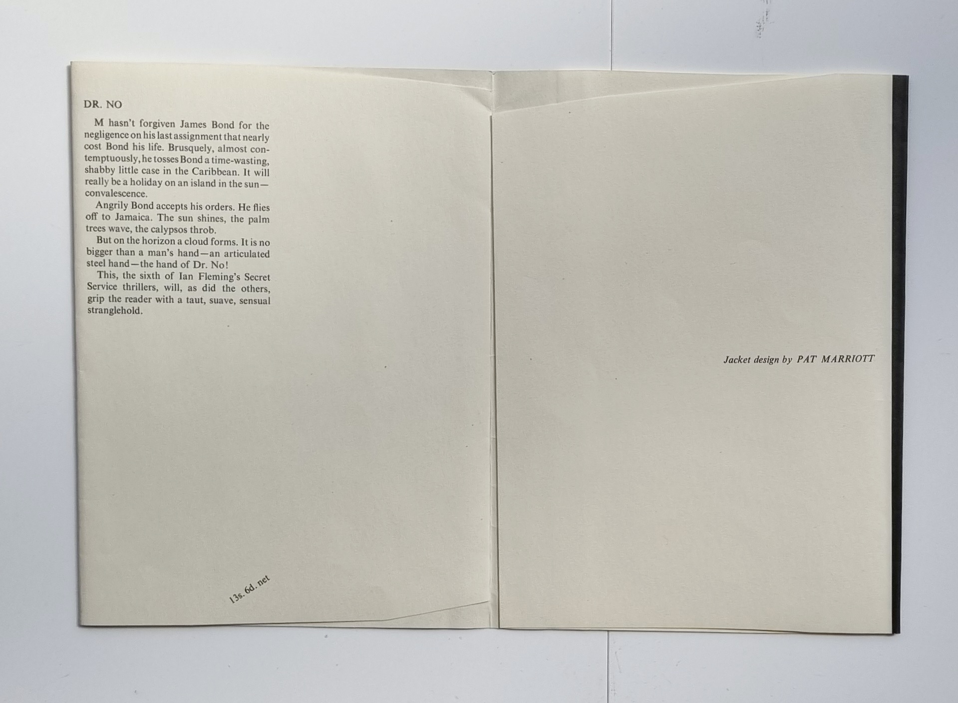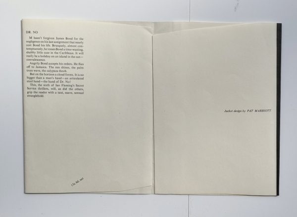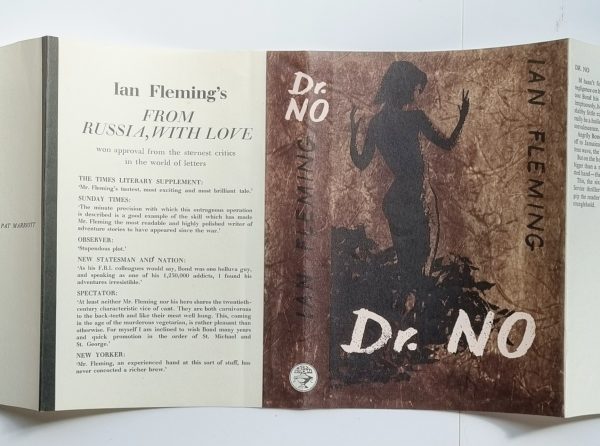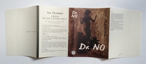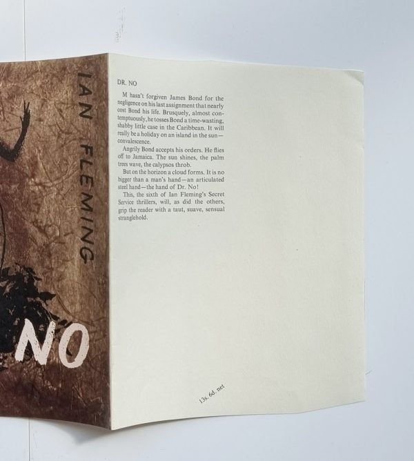 PROOF DUST JACKET – (NO BOOK) – The dust-jacket for ‘Dr. No’ was designed by Pat Marriott. A fine example of the Proof dust jacket. The panels and spine are the same width as the published jacket, but the proof jacket is slightly taller with extremely wide un-trimmed flaps. The proof jacket corresponds to the first impression jacket, except that the ‘Greek urn’ circular device on the spine is bright white as opposed to off-white, and differing in the dimensions to the extent that it would not fit around a copy of the book unless the flaps were trimmed. Gilbert A6a(1.1 or 1.2). Exceedingly uncommon.