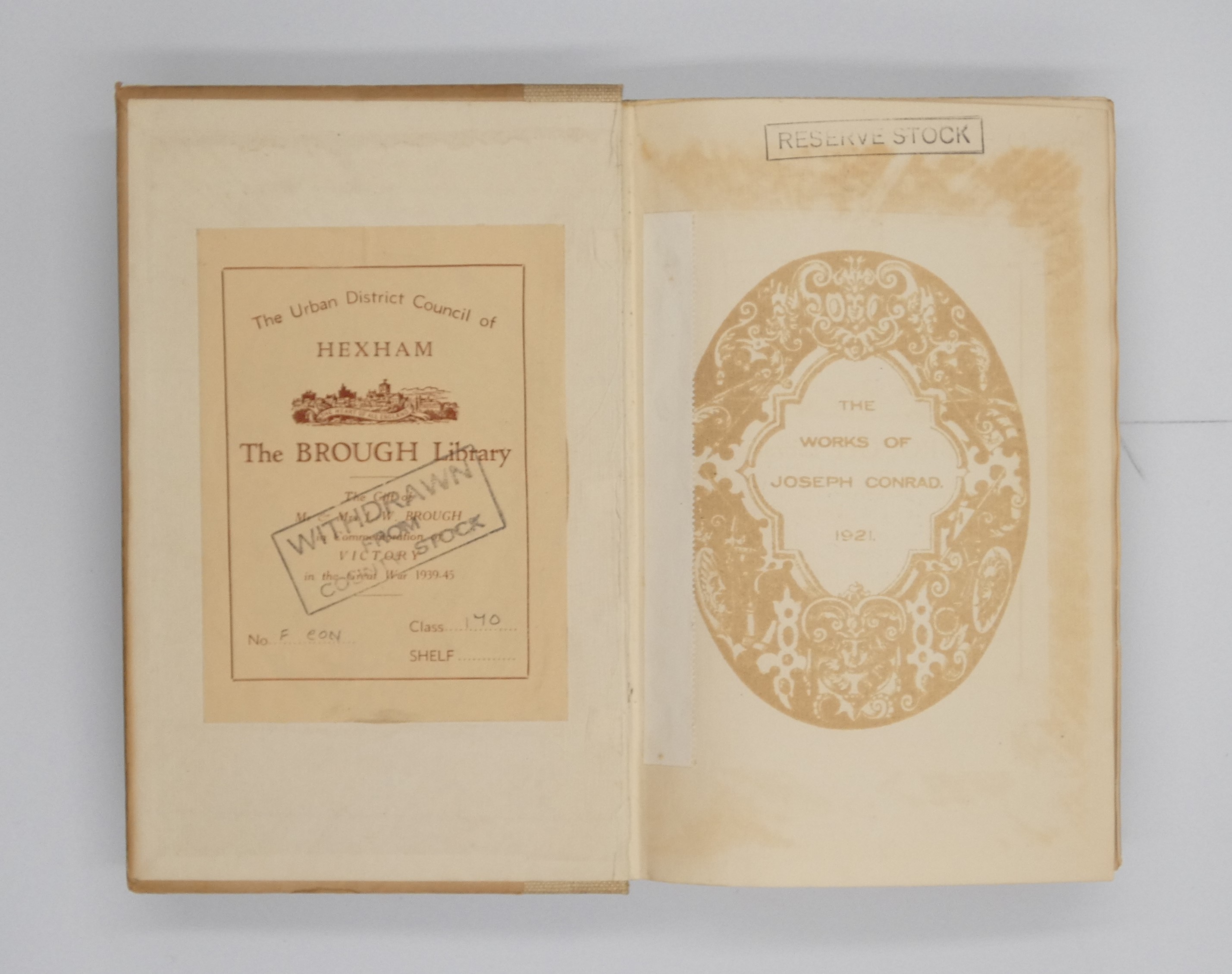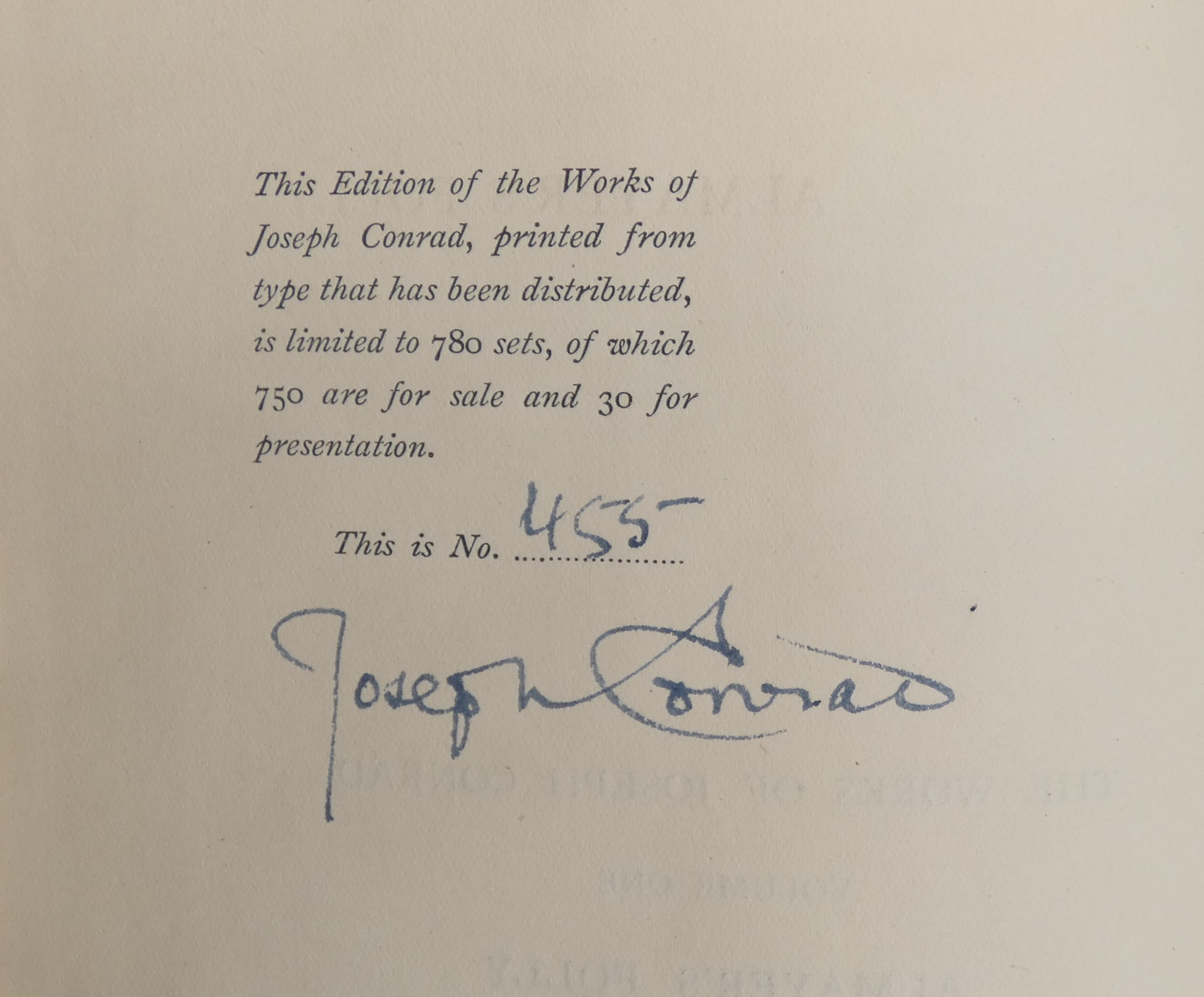 HARDBACK – Volume One only from the signed limited edition of the works of Joseph Conrad, Number 455 of 780 copies, thirty of which were for presentation. Seven Hundred and fifty for general sale. This book was originally part of a twenty volume set but is offered for sale as a separate title. The book is bound in its original cloth that shows light soiling to the front and rear boards. Internally clean with the rough cut pages. There is a Hexham library sticker to the front paste down with a small reserve stock stamp to the top of the front free end paper. The inner text is surprisingly clean with no stamps inset. There is a small card holder to the rear paste down, that may be removable with a little care. A tightly bound book. Boldly signed by Joseph Conrad on the limitation page of this volume one. Seller Inventory # 002570