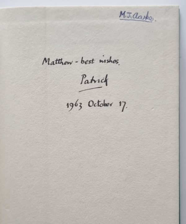 HARDBACK – A near fine book bound in the publisher’s green cloth boards with bright silver lettering present to the spine. There is just a touch of pushing to the spine tips, aside from the pushing, the boards are very clean and fresh. Internally clean with a touch of foxing to the closed text blocks. No foxing or finger marks inset. There is a small name to the top of the front end-paper just above the authors inscription ( M.J. Clarke ). Signed and inscribed by the author to the title page. The inscription reads. MATTHEW – WITH BEST WISHES / PATRICK / 1963 OCTOBER17. Matthew Clarke was a lifelong friend of Sir Patrick’, his father having served in the RAF with Mr Moore. The family connection continued throughout the astronomer’s life, especially after the early death of Matthew Clarke’s parents. An excellent association copy. The dust wrapper is in near fine condition with no loss or tears and with bright colouring. Light soiling to the rear panel. The publisher’s printed price of 10s.6d.net is present to the front flap. Seller Inventory # 002273