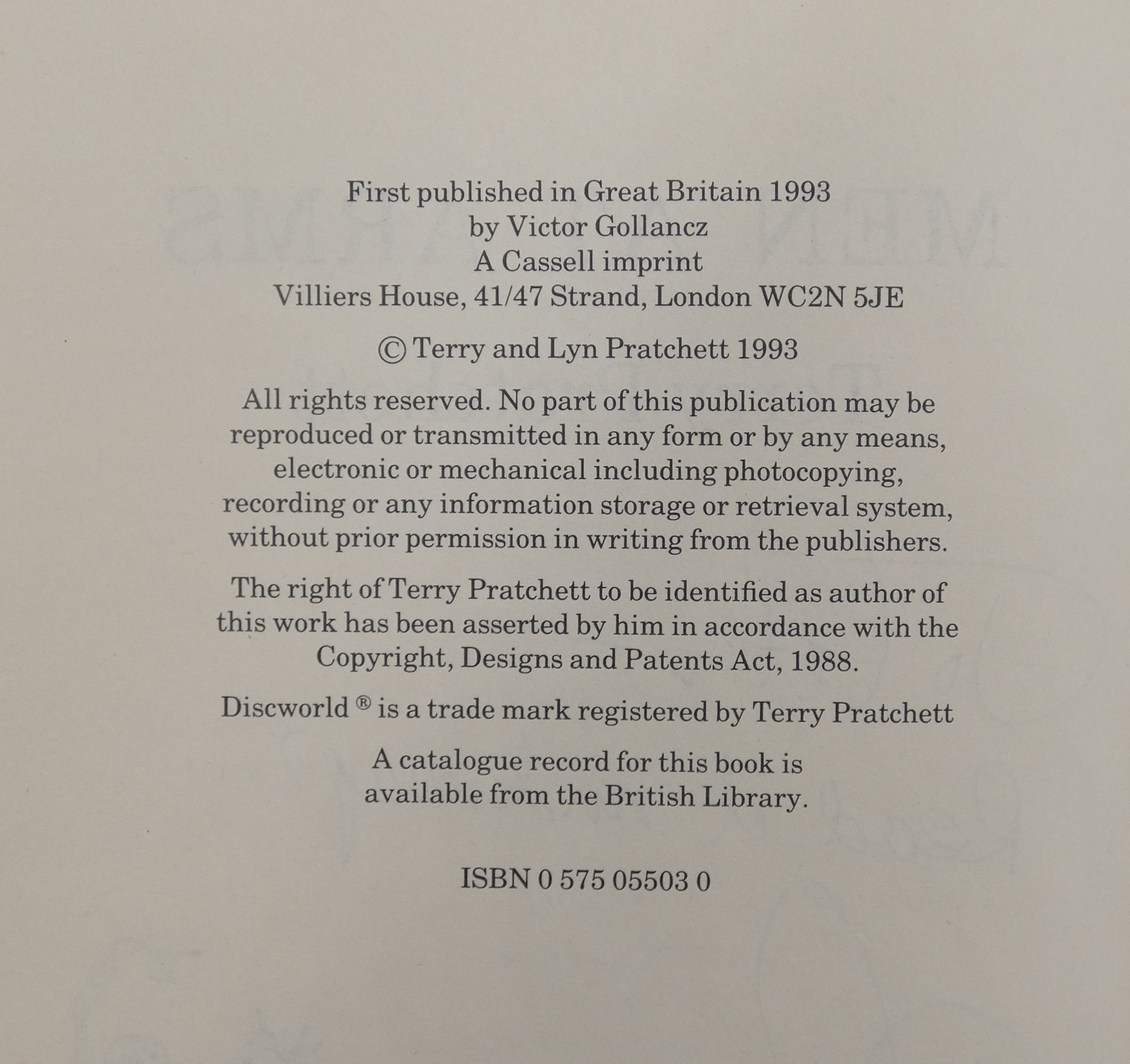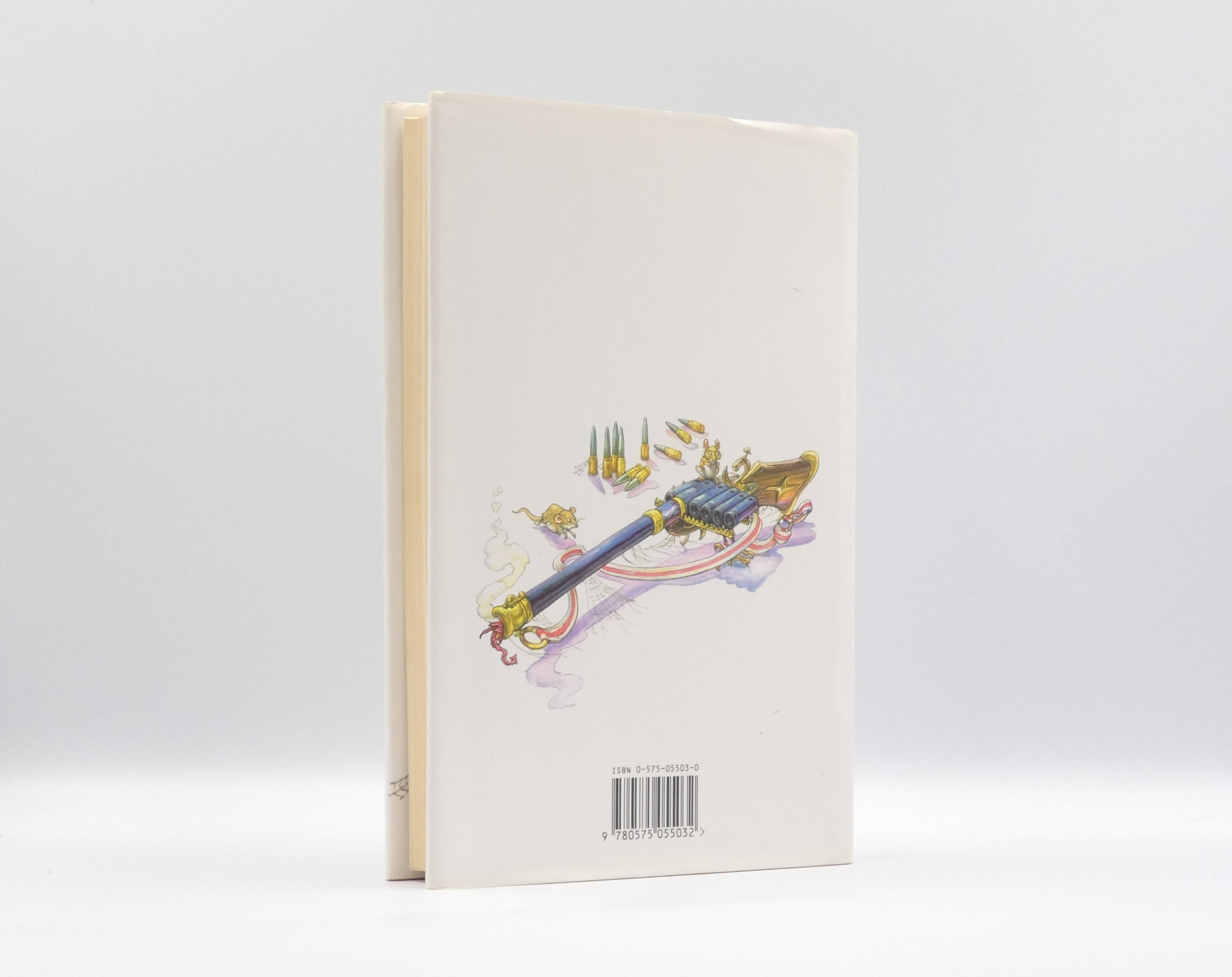 HARDBACK – A near fine book bound in the publisher’s red cloth boards with bright gilt lettering to the spine. There is a little pushing to the base of the spine, but the boards are very clean indeed. Internally, the closed text block and inner pages are lightly toned but clean and fresh, free of any previous owner names or inscriptions. Boldly inscribed by the author to the title page, the inscription reads – TO PETER / READ IT AND REAP / TERRY PRATCHETT. The author signature in contemporary to the age of the book. The dust wrapper is in near fine condition with no loss or tears and with no fading to the spine. The publisher’s printed price of £ 14.99 is present to the lower front flap. Seller Inventory # 002538