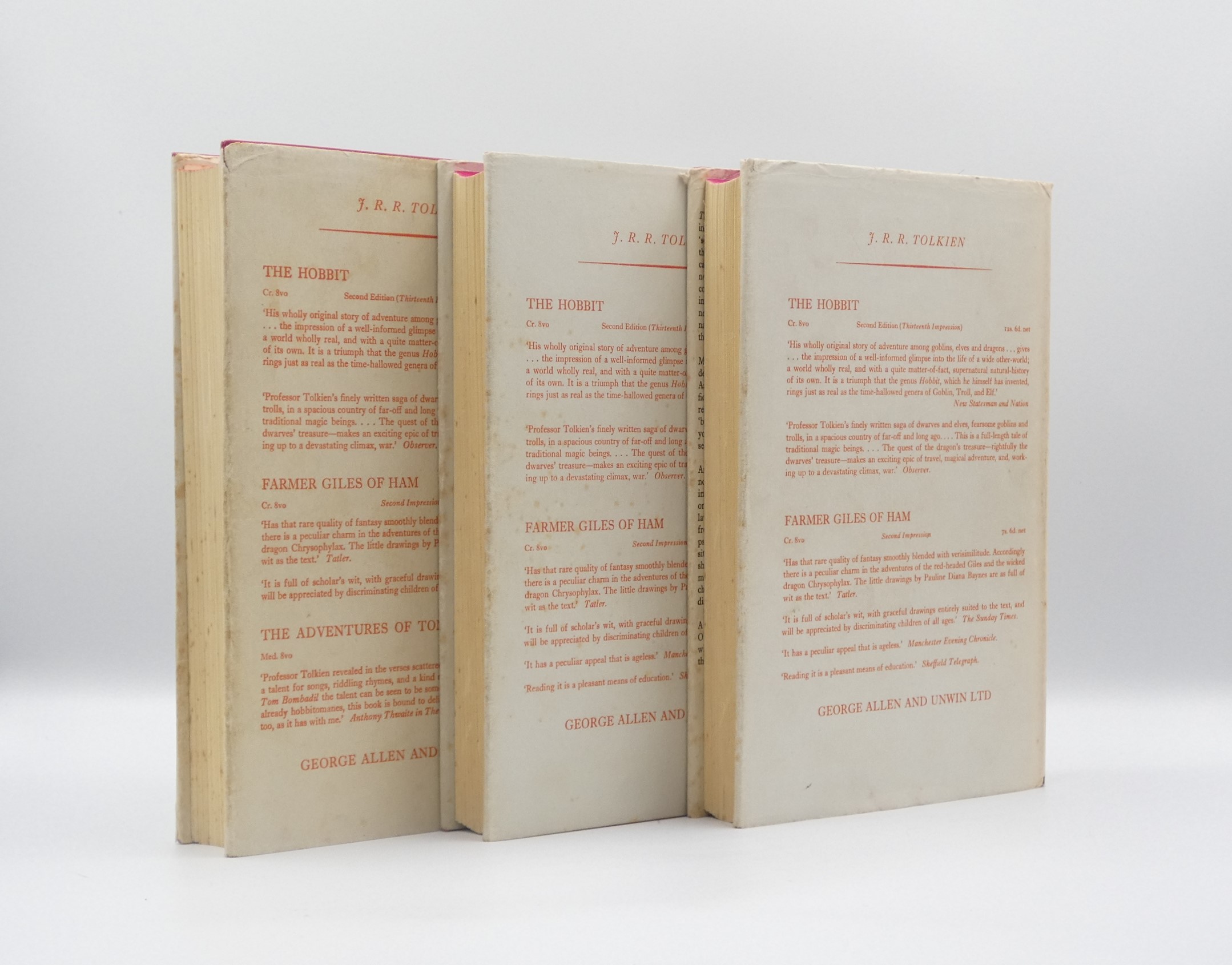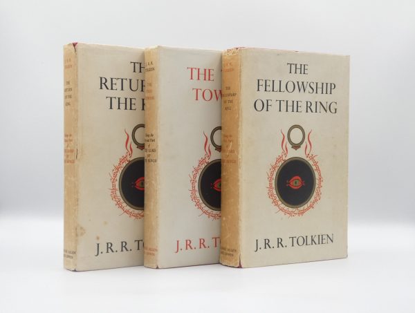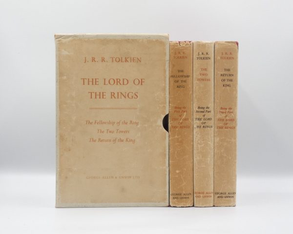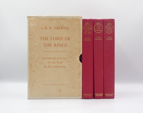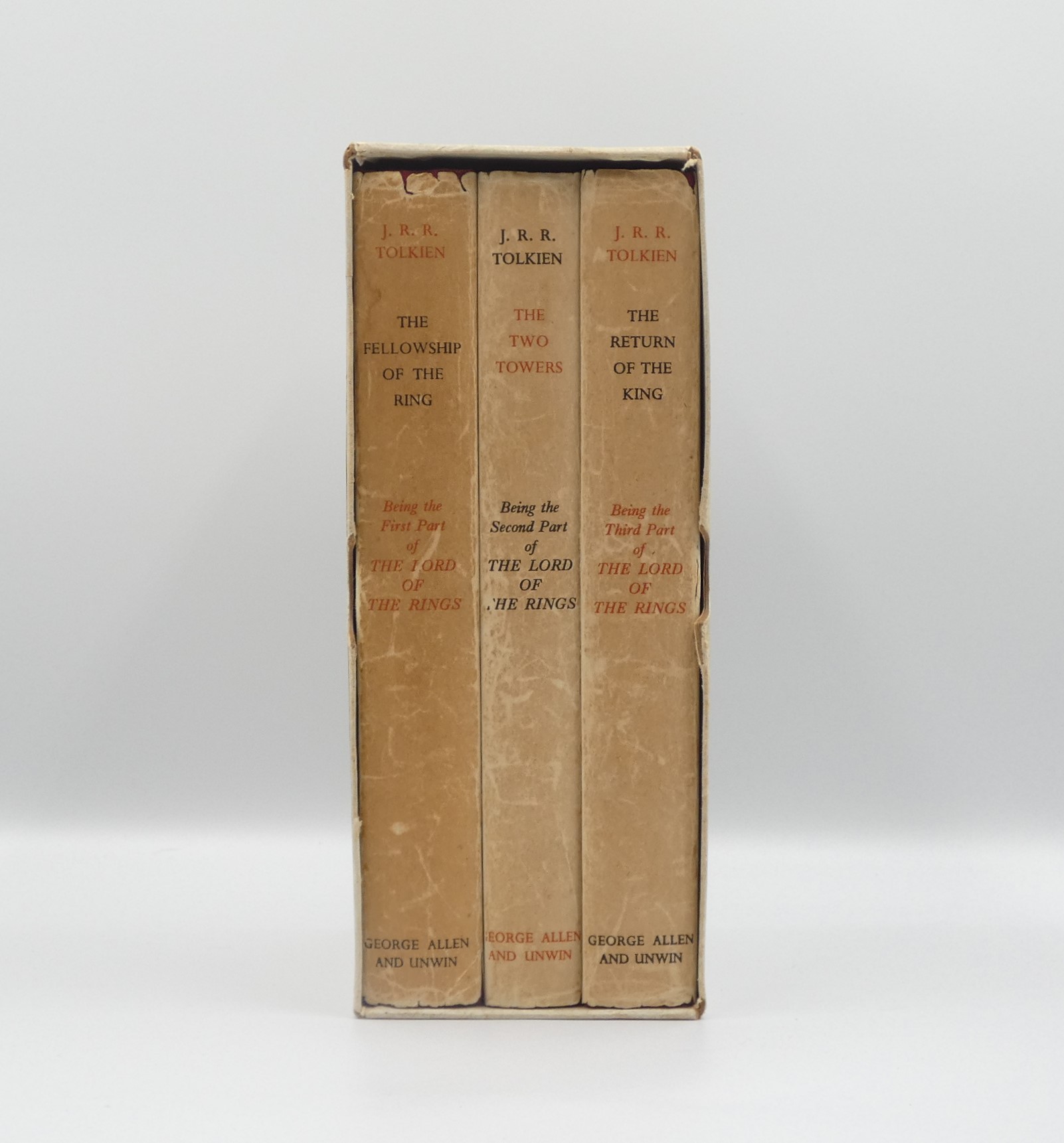 HARDBACKS – The books are in very good condition, bound in the publisher’s red cloth boards that are clean with gilt lettering to their spines. The boards or The Fellowship of the Ring and The Two Towers are in near fine condition with lovely bright red boards. There is some light spotting to the front board of the Return of the King. The spine and rear panel are very bright indeed. The red top stains of all three books are bright. Internally, the pages are clean and fresh with just a touch of foxing to the closed page blocks. The foxing is absolutely minimal. The maps are present to the rear of each of the three titles. The dust wrappers are in very good condition with toning to the spines and with some light age related soiling to each title. There are a few spots to the front panel of The Return of the King. All three titles have their publisher’s printed price of 21s.net to the front and rear flaps. Included with these books, is the official Allen and Unwin slipcase box that has soiling to its spine. Seller Inventory # 002295