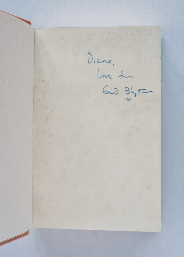 HARDBACK – Superbly rebound by the world renowned Bayntun-Riviere of Bath. Sumptuously re-bound in full peach morocco with all edges gilt, five raised bands that have been lined in gilt to the spine with the title blocked in gilt in panel two and with the author’s name blocked in gilt in panel three. Enid Blyton’s autograph blocked in gold to the front board. Internally, the inner pages are very clean and fresh, Inscribed by Enid Blyton to the second blank end-paper. The Inscription reads DIANA / LOVE FROM / ENID BLYTON ink blue ink. The front panel and spine of the original binding have been incorporated into the rear text of the book. The re-binding of this title is of the highest quality and the end result is a book that looks absolutely stunning.