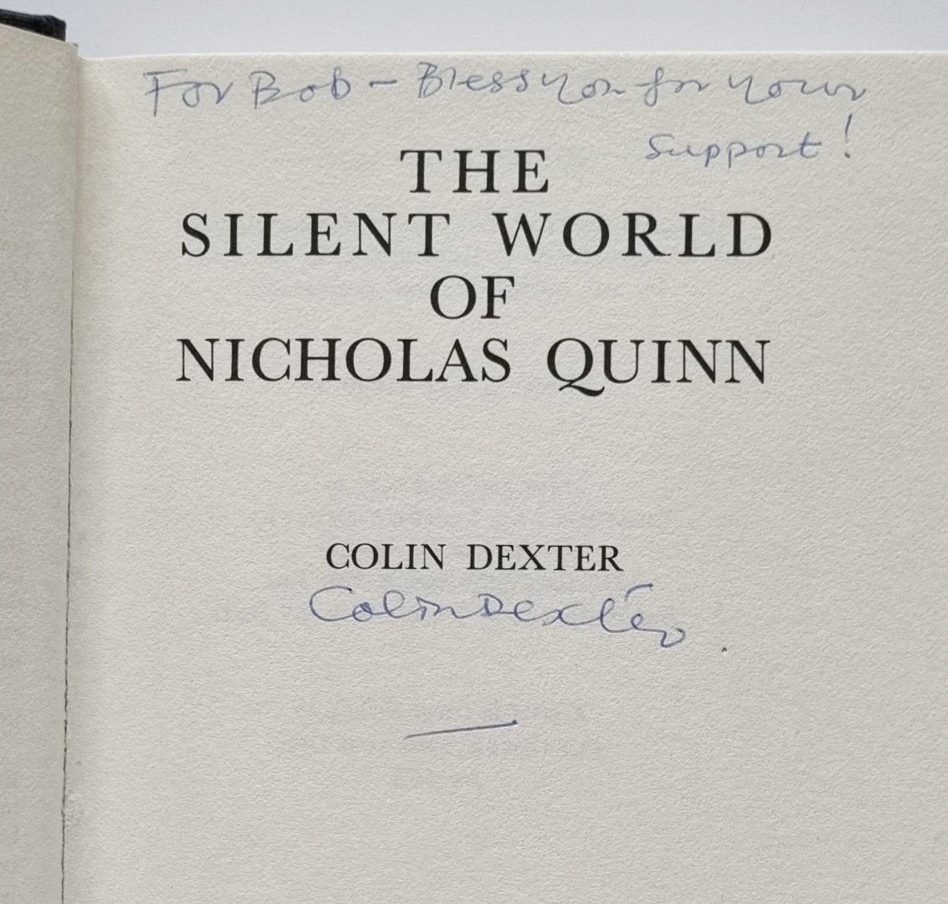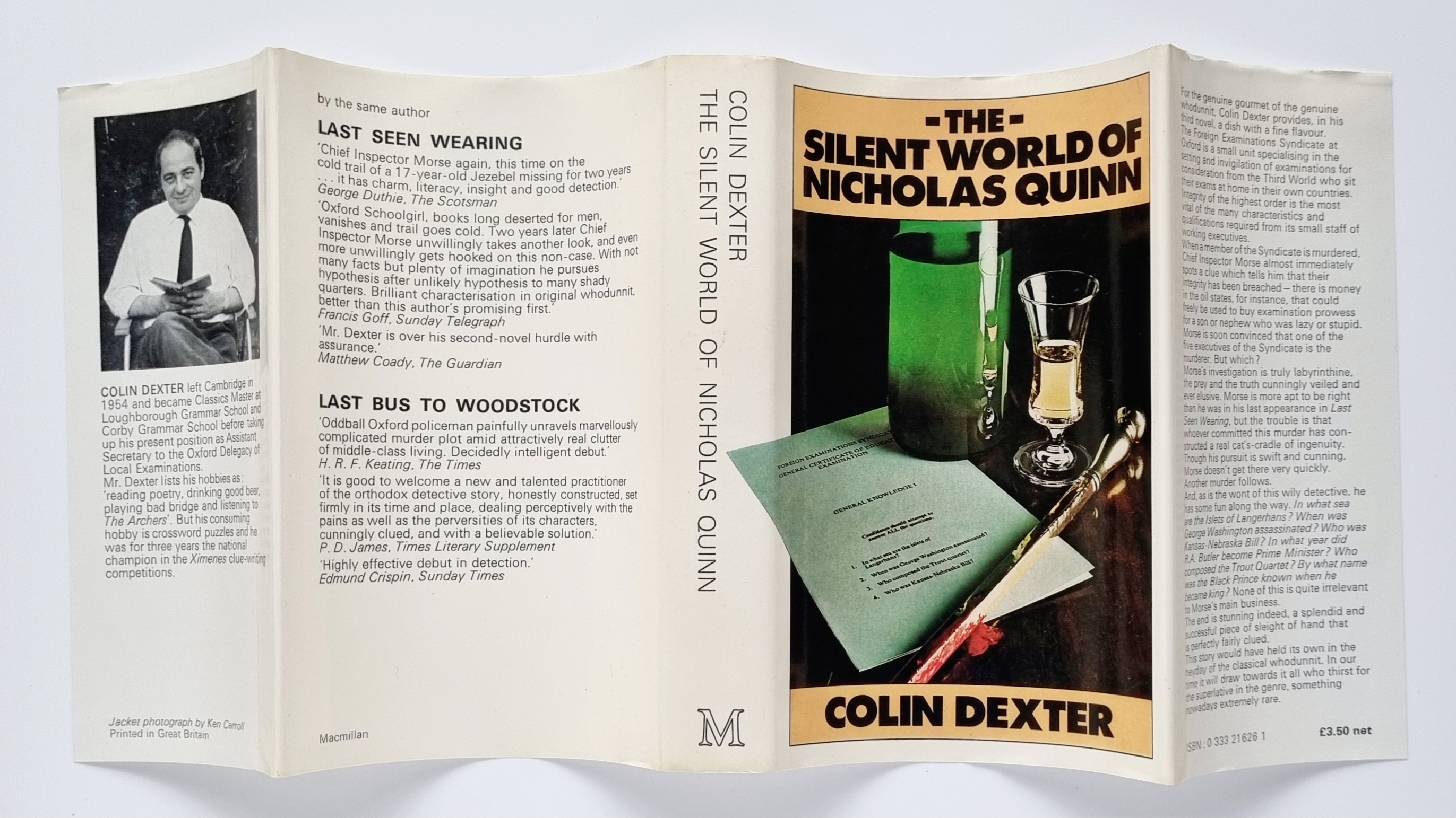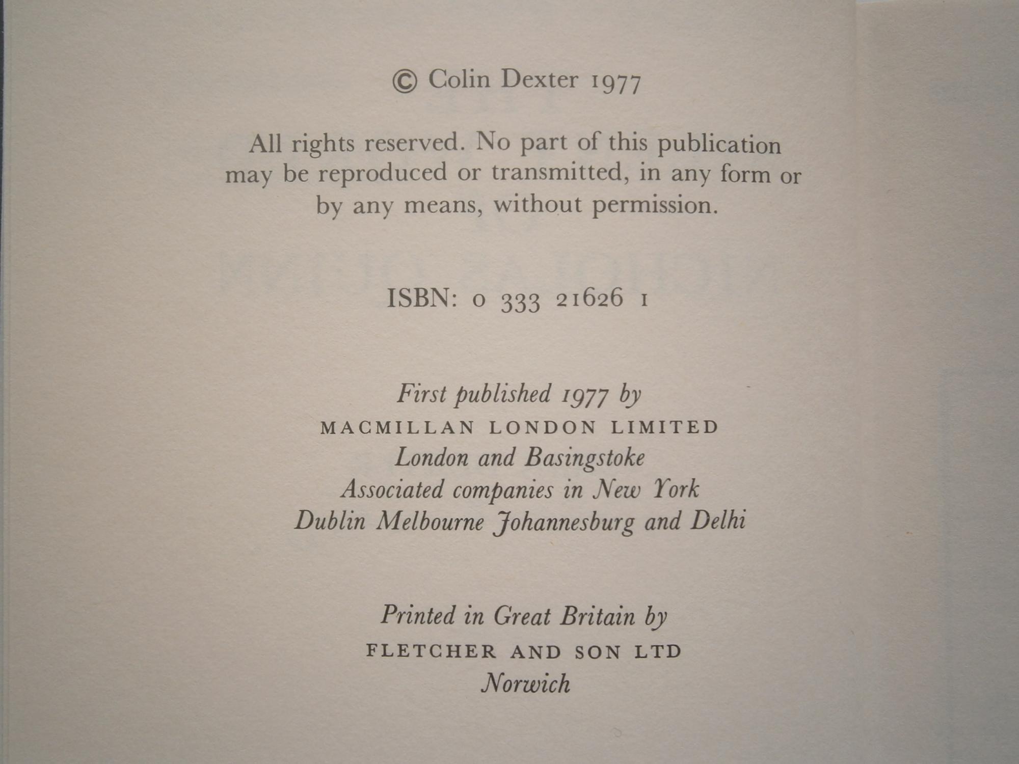 HARDBACK – A fine book that has been signed and inscribed by the author to the title page. The boards are very clean indeed, with just the faintest pushing to the base of the spine. The pages are very clean and white, free of any previous owner names or Inscriptions. The dust wrapper is in fine condition, free of any loss or tears, and has not been price clipped. The colours are very fresh with non of the usual toning found to the spine, or to the rear panel. A superb example of the book, and a very scarce Inspector Morse title to obtain in unread condition. Bookseller Inventory # 001074