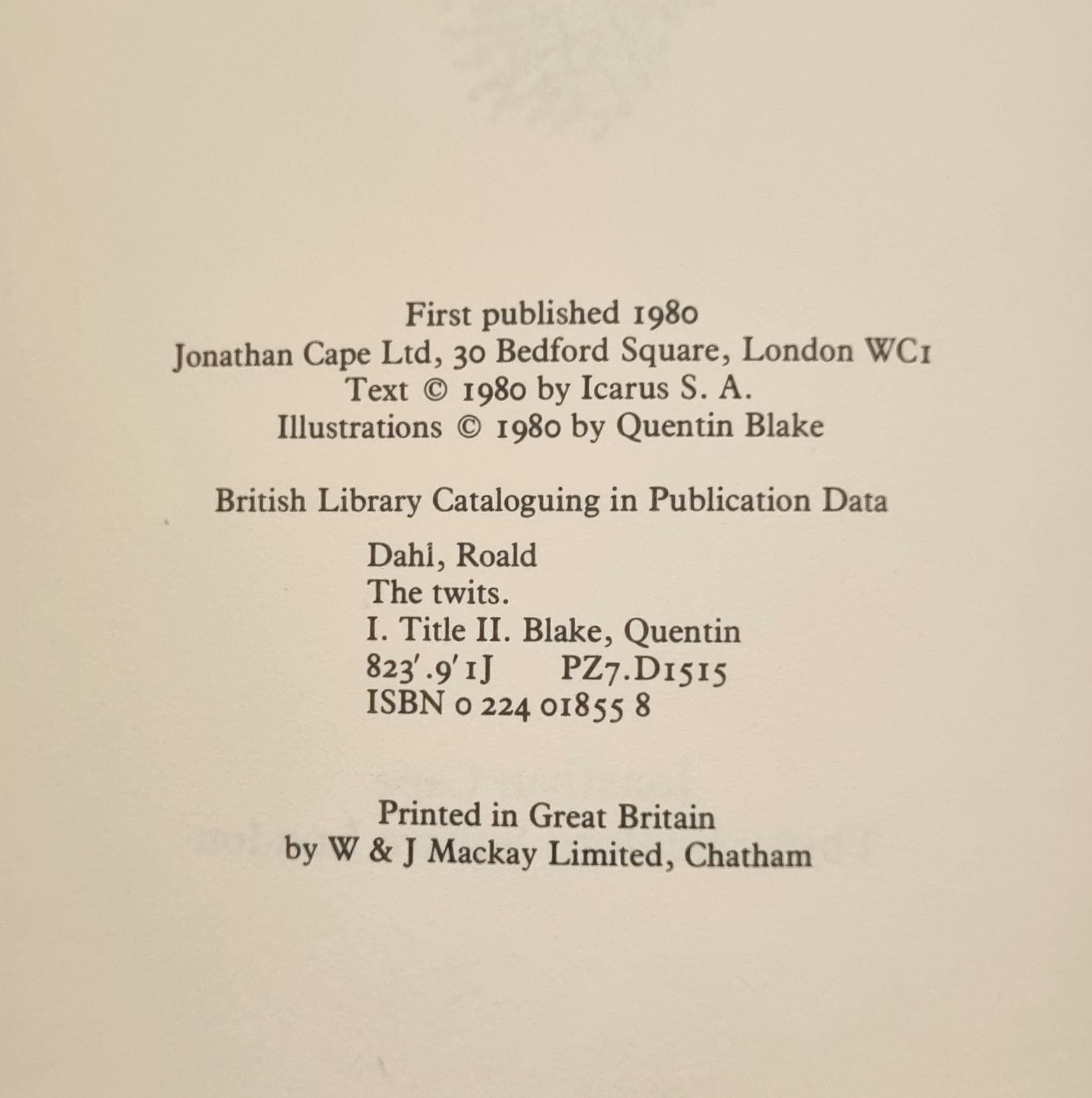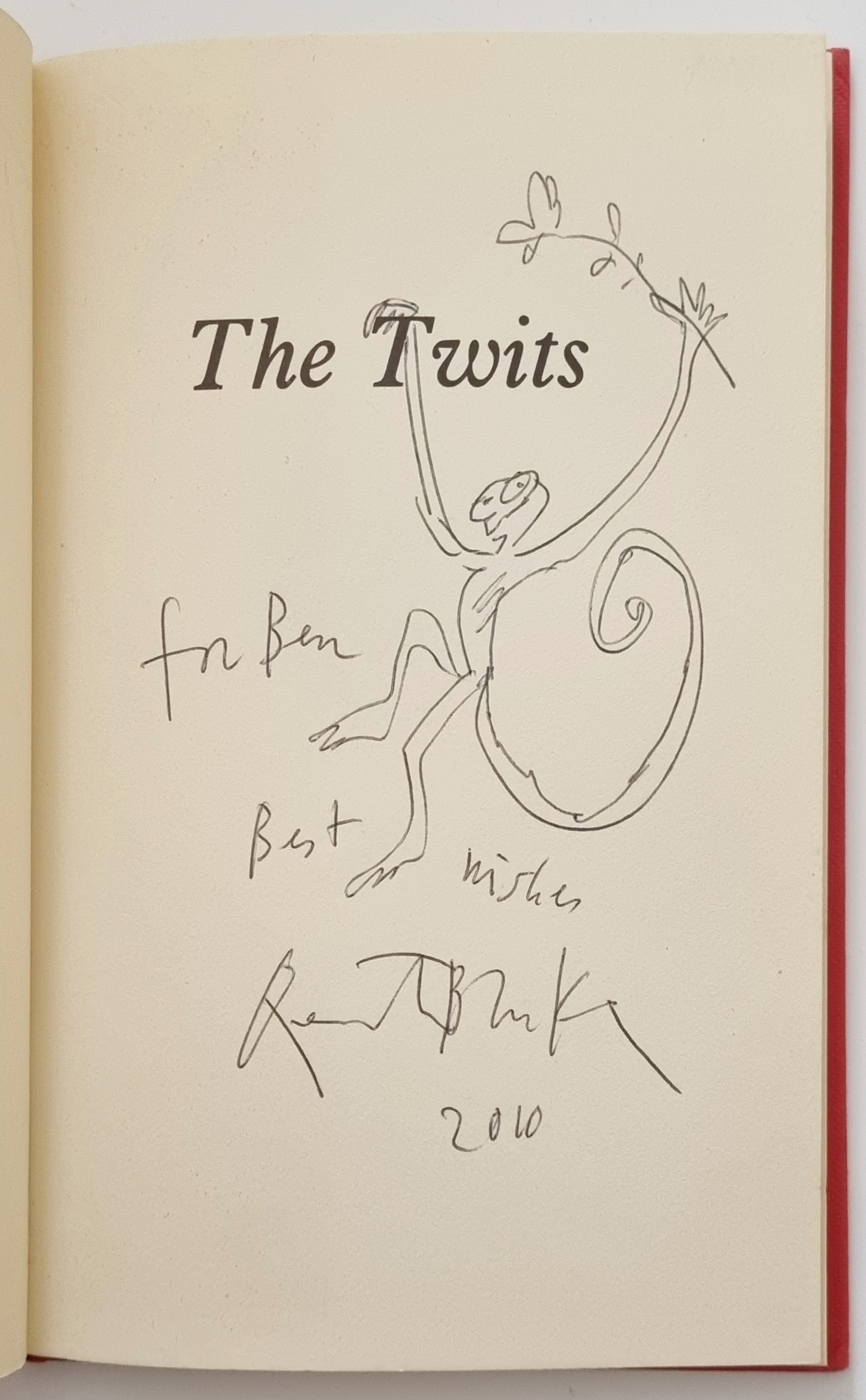 The Twits – INSCRIBED BY THE AUTHOR IN THE YEAR OF PUBLICATION – ALSO WITH AN ORIGINAL DRAWING WITH INSCRIPTION BY THE ILLUSTRATOR QUENTIN BLAKE TO THE HALF TITLE PAGE – Roald Dahl