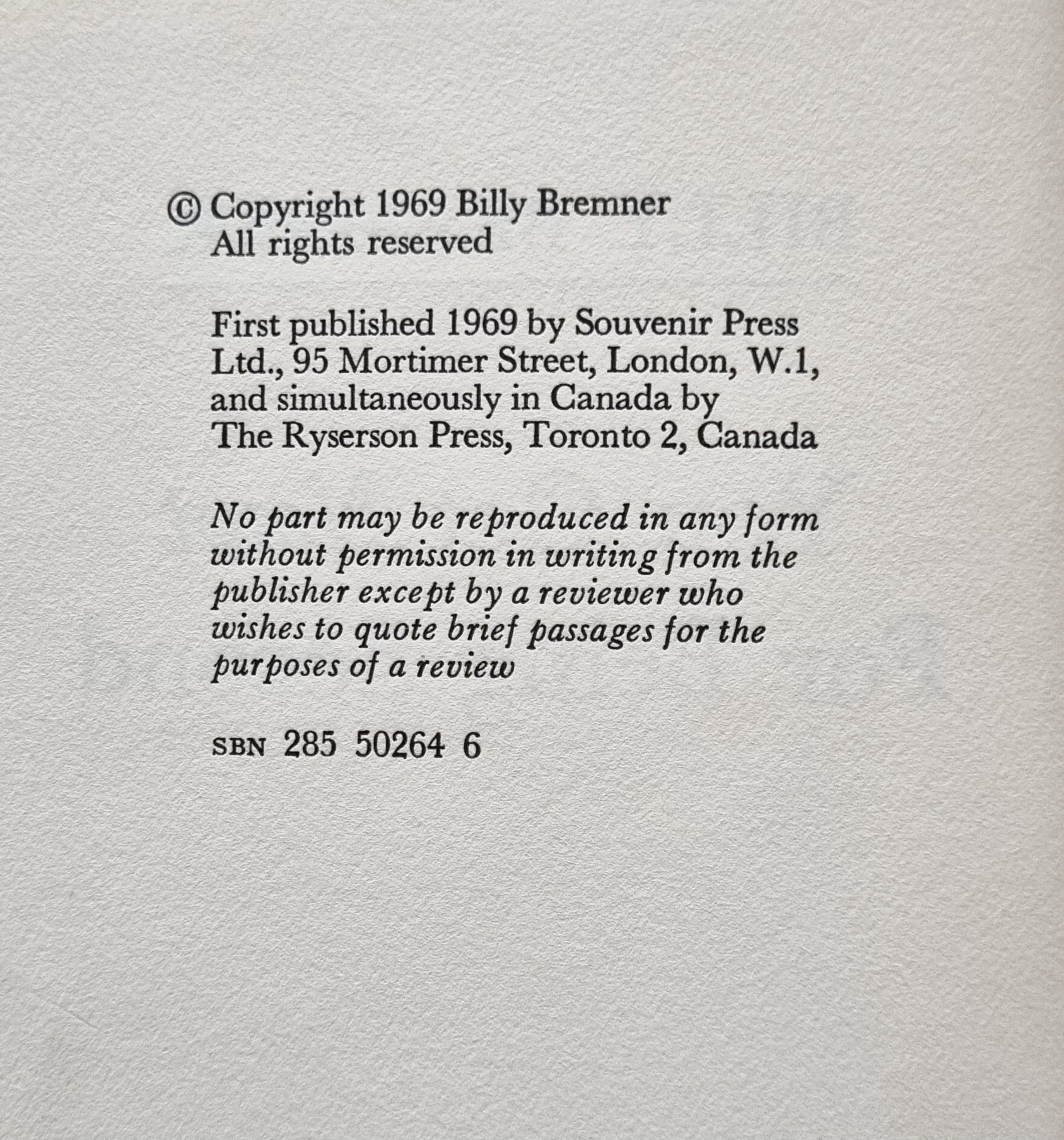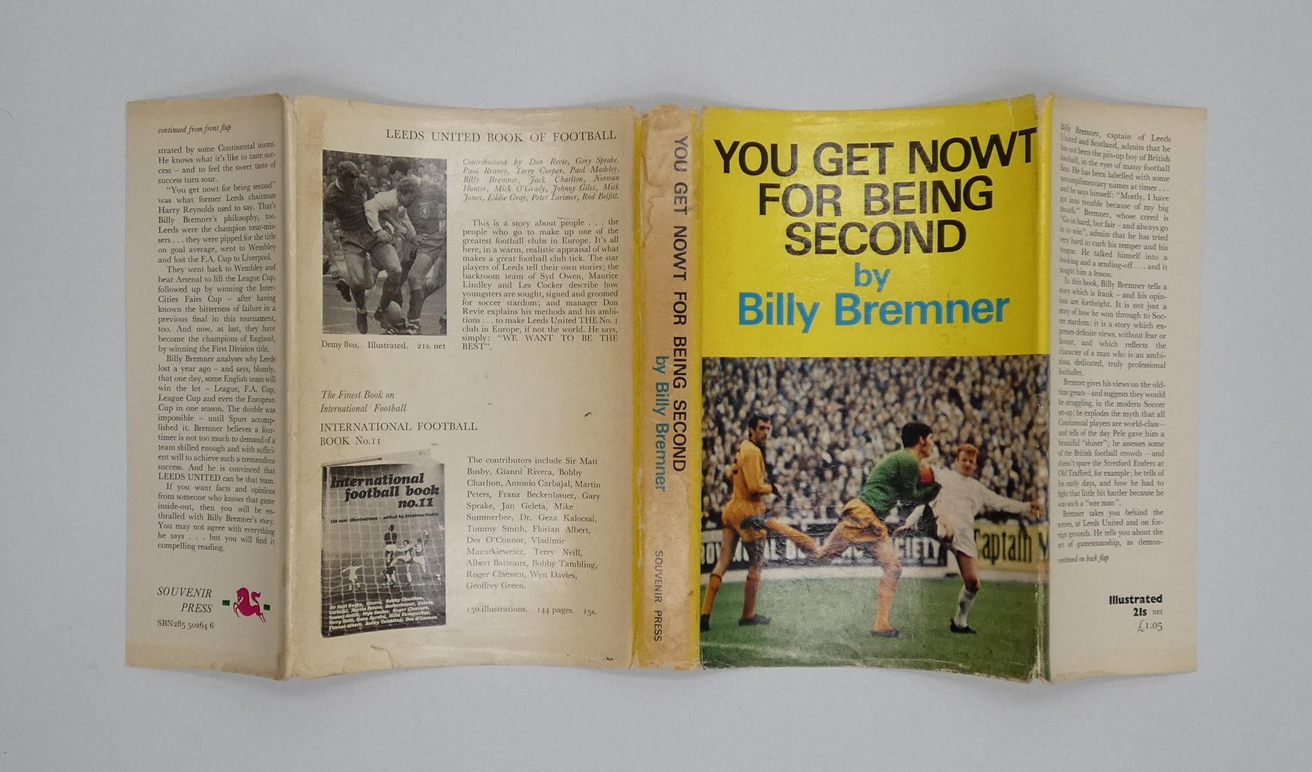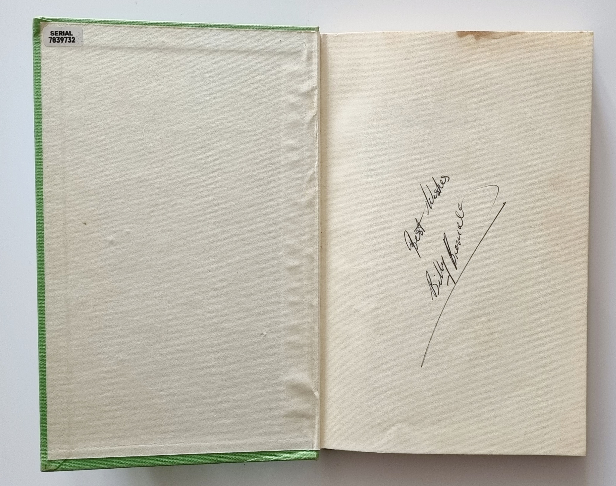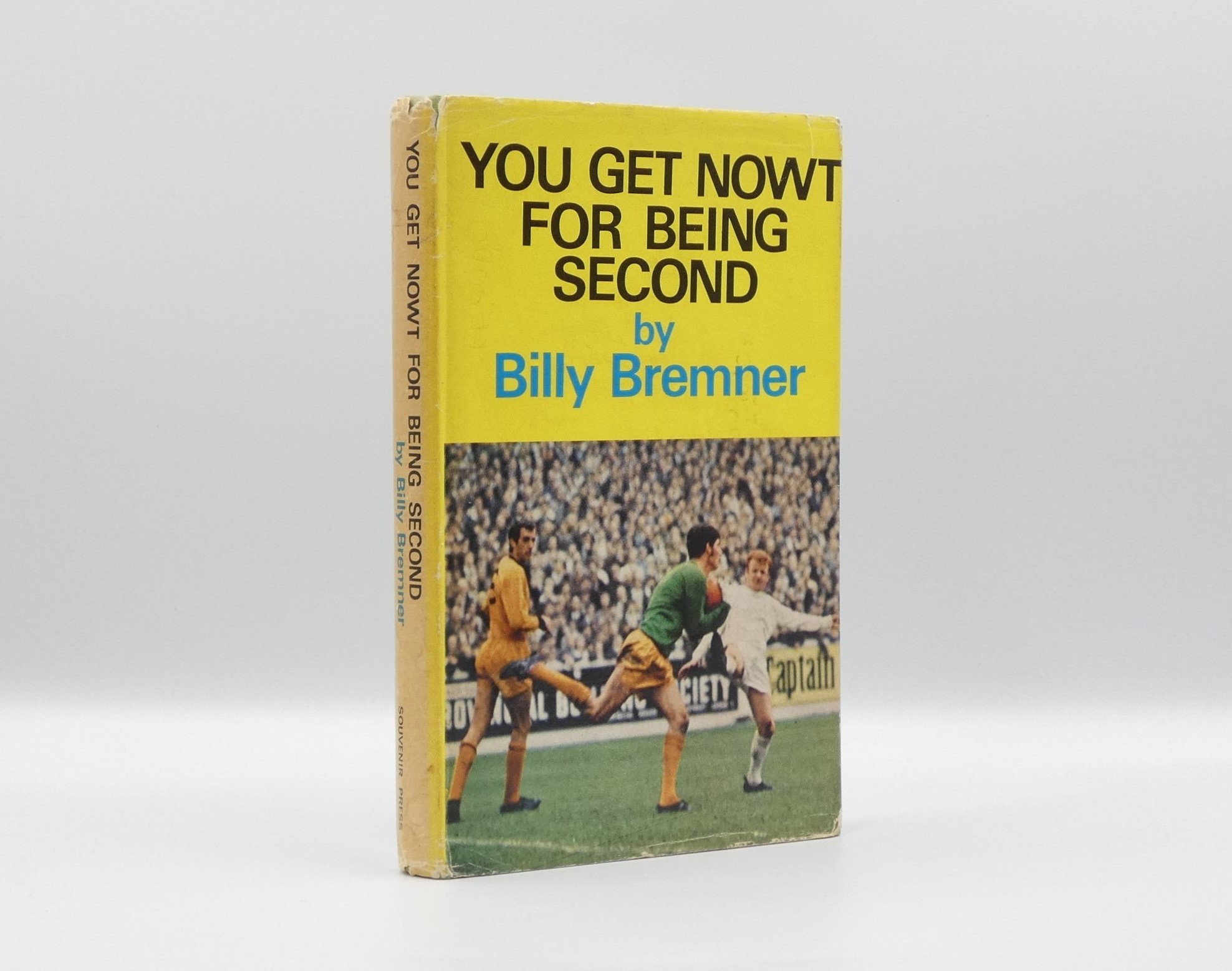 HARDBACK – A near very good book bound in the publisher’s green boards that are a little faded to the base of the spine, also with light staining to the top of the rear panel. Internally, there is a water stain to the top page block that has encroached into the top edges of a few pages. Aside from the water stain the inner text is clean, free of any previous owner names or inscriptions, there is a small sticker to the top corner of the front paste down. Boldly signed by Billy Bremner to the front end-paper. The inscription reads – BEST WISHES / BILLY BREMNER. The dust wrapper is also in near very good condition with light chipping to the spine tips, also to the corners of the front and rear flap folds. There is rubbing to the extremities, with some fading to the spine. There is also light water staining to the tip and tail of the spine. The publisher’s printed price of 21s net £ 1.05 is present to the base of the front panel. Seller Inventory # 002377